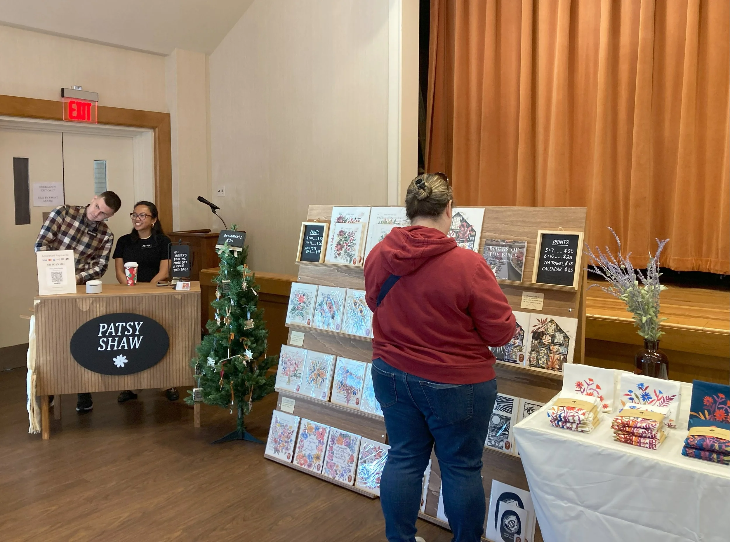 Art prints (hymn watercolor paintings and block prints in 5x7in or 8x10in size), tea towels, stationery (i.e., notepads, bookmarks, stickers, pencils, greeting cards), hats, ornaments, book pillows, keychains, calendars, and tote bags.